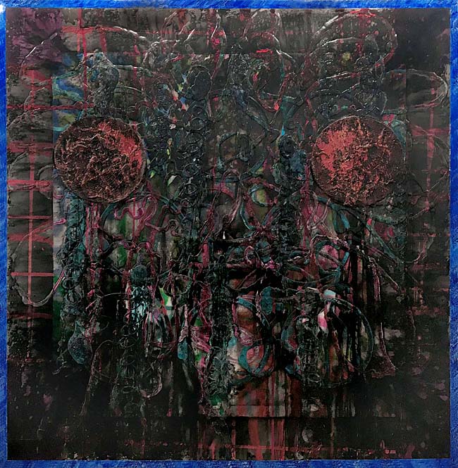 Acrylique, huile et laque-vernis sur toile, 100 x 100 cm.